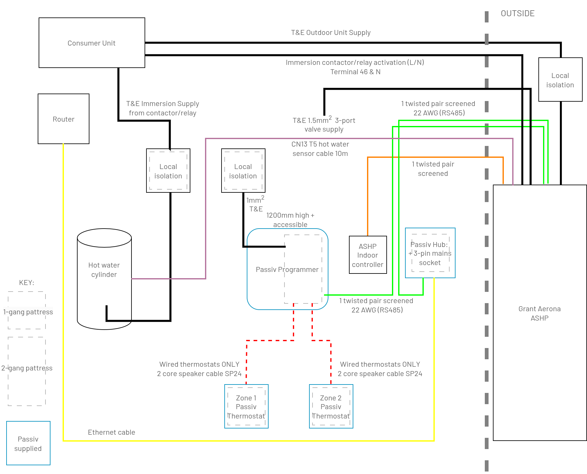 Additionally, if the green RS485 cable runs are longer than 100m, instead of using 1 twisted pair screened cable use 2 twisted pair screened cable, as connecting the GND, A & B between the Grant heat pump and the Programmer will require 3 cores.