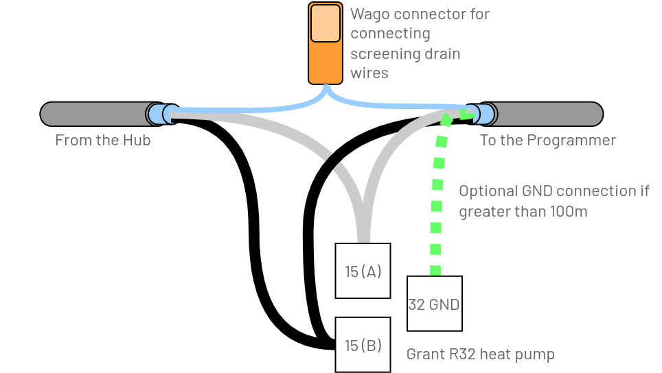 - Connect both screened drain wires together, insulate and carefully locate it at the edge of the PCB to reduce the chance of a short-circuit. Do NOT use the Grant RS485 GND connection for this purpose