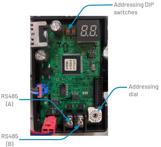 Set the MIM-B19N “Addressing DIP switches” next to the “8.8.” in the ON (up) position and the “Addressing dial” set to “1”. If these settings are changed whilst the MIM-B19N is powered up, disconnect the 12v DC connector on CN12 or switch the heat pump off and back on again after 5 seconds for the RS485 address to take effect.